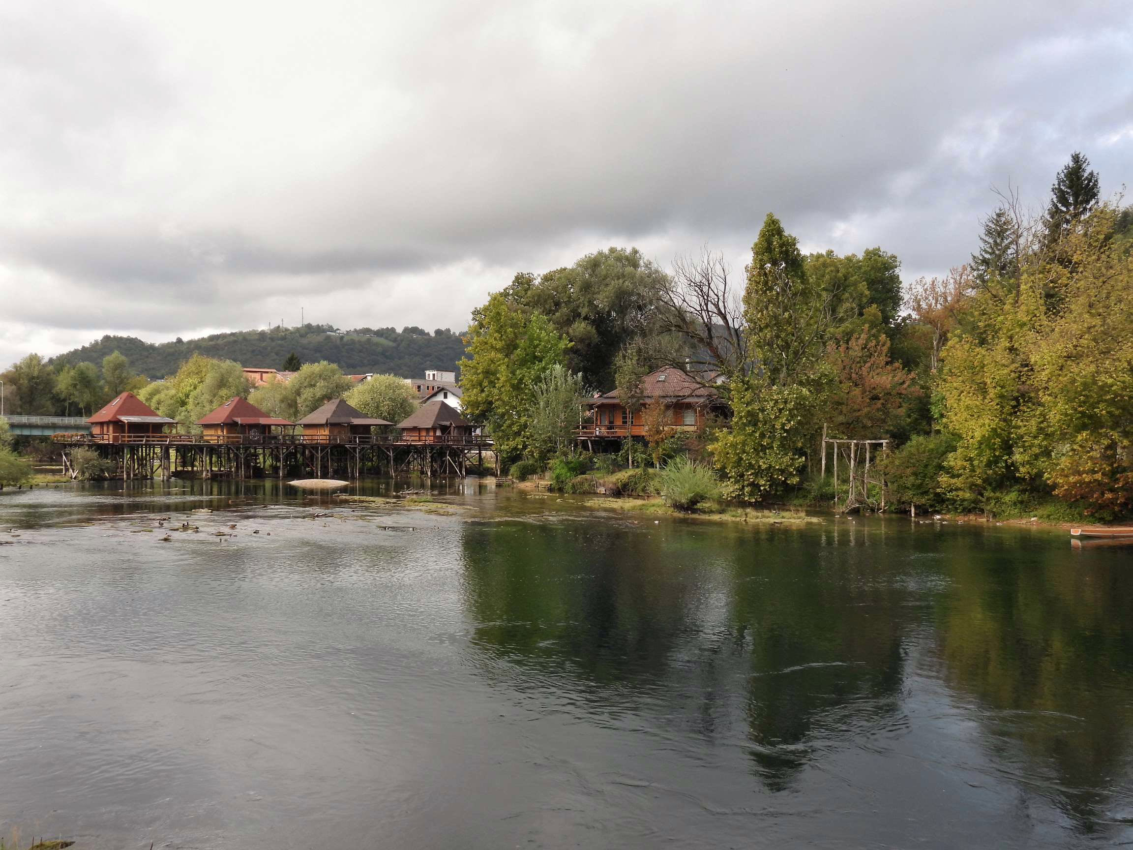 We zien veel vissende reigers en langs de oevers vliegen tjiftjafs speels van tak tot tak. Verderop is een klein drassig strookje groene oever waar een aantal zwartkoppen aan het badderen is. De stilte, het bos, de traag stromende rivier en de foeragerende vogels, je ontspant hier tot op het bot. Je zit hier overigens maar op een kilometer of 5 afstand van Bihac waar wel het een en ander te doen en te zien is. Wij slaan echter Bihac over ten faveure van: